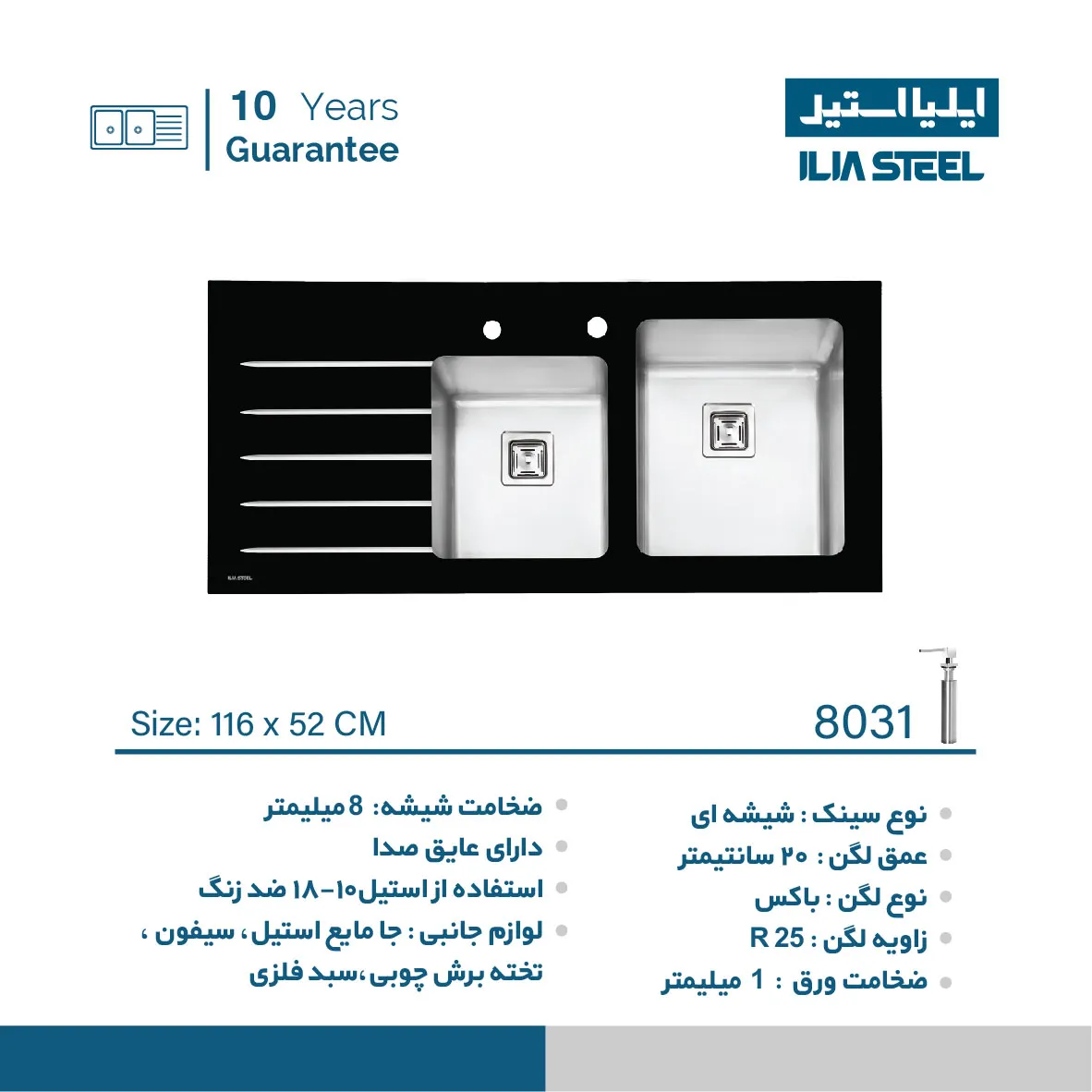 مدل 8031 ایلیا استیل با طراحی شیشهای خاص و استیل ضد زنگ 18/10، بهترین انتخاب برای آشپزخانههای مدرن و لوکس است. این سینک با ابعاد 52×116 سانتیمتر، ضخامت ورق 1 میلیمتر و عمق لگن 20 سانتیمتر، طراحی منحصر به فردی دارد. زاویه لگن R25 و ضخامت شیشه سکوریت 8 میلیمتر، سینکی با کیفیت و مقاوم ایجاد کرده است. این سینک همچنین دارای عایق صدا است که از ایجاد سر و صدا هنگام شستشوی ظروف جلوگیری میکند. لوازم جانبی شامل سیفون، جامایع استیل، تخته برش چوبی و سبد فلزی از دیگر مزایای این محصول است. بستهبندی مقاوم نایلون شیرینگ و گارانتی 10 ساله، کیفیت بالای آن را تضمین میکند.